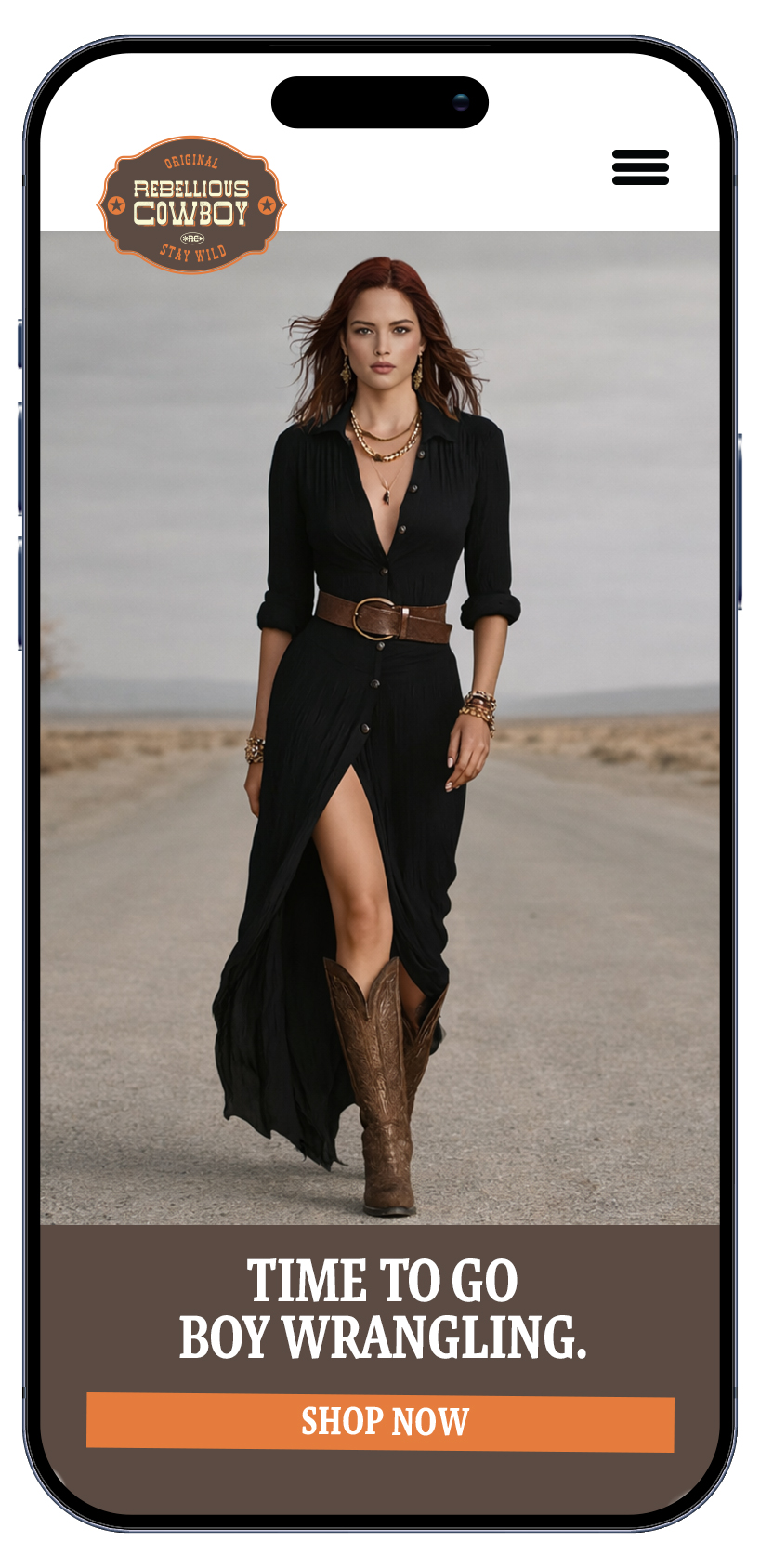 Rebellious Cowboy needed to launch as a fully realized women’s fashion brand—bold, rebellious, and credible—without the budget typically required to do it right. There were no funds for professional models, studio photography, or a large creative team, yet the brand still needed to feel intentional, premium, and unmistakably confident from day one. The challenge wasn’t just designing a logo or a website—it was making a brand with no visible compromises, while filtering the audience to attract risk-takers and repel the rest.